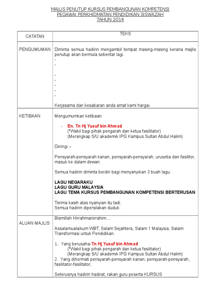 Teks pengacara majlis ini kebiasaannya akan berguna untuk persediaan majlis penutupan program tersebut.