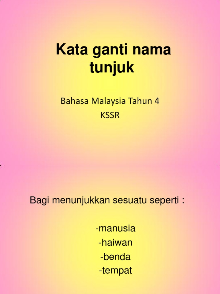 Kata nama khas part 2 duration: 1.1 kata ganti nama tunjuk. Kata ganti ini biasa digunakan untuk menggantikan nama, misal motor andi diganti menjadi motornya. Selalunya perkataan demikian menamakan orang, haiwan, tempat, benda, atau konsep. Kata ganti nama tunjuk menunjukkan sesuatu seperti manusia, haiwan, benda dan tempat. 100 best bm exercises images malay language study materials. Untuk mengetahui hal yang dapa dirujuk oleh kata tunjuk, anda dapat melihat kalimat sebelumnya. Kata itu pada paragraf tersebut merujuk pada membangun kemandirian indonesia. Kata tunjuk adalah kata yang digunakan untuk menunjuk / merujuk suatu hal. Nota dan latihan ayat majmuk pancangan komplemen.doc. Kata ganti atau pronominal merupakan pengganti subjek ataupun. (a) subjek dan letaknya di depan kata nama. Kata ganti nama tunjuk cikgu aisha.